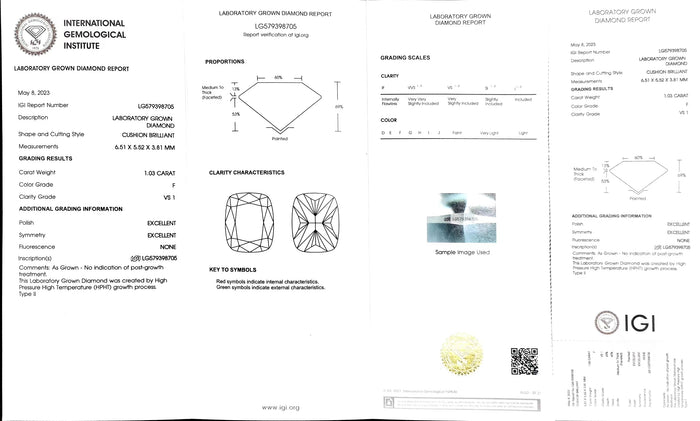 IGI Certificate #: LG579398705 (We will ship the lab-grown diamond to you along with the IGI certificate. You can scan the barcode on the report to access the third party certificate.)