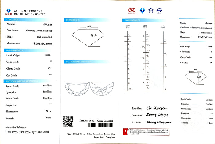 NGIC Certificate #: NPA2444(We will ship the lab-grown diamond to you along with the NGIC certificate. You can scan the barcode on the report to access the third party certificate.)