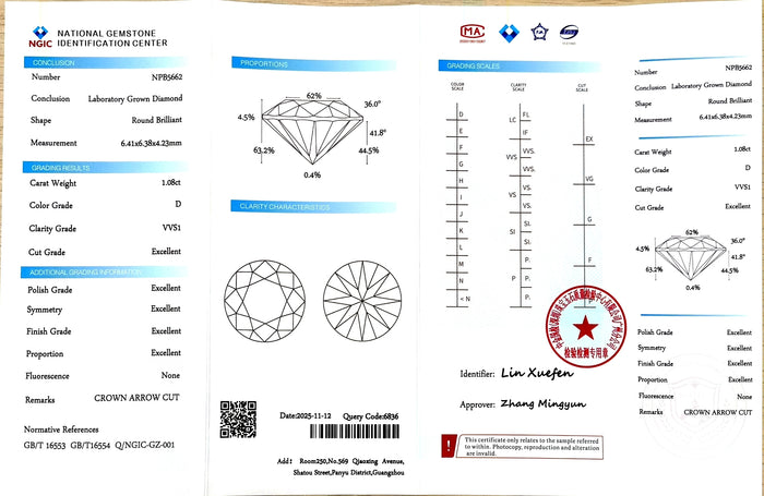 NGIC Certificate #: NPB5662(We will ship the lab-grown diamond to you along with the IGI ertificate. You can scan the barcode on the report to access the third party certificate.)