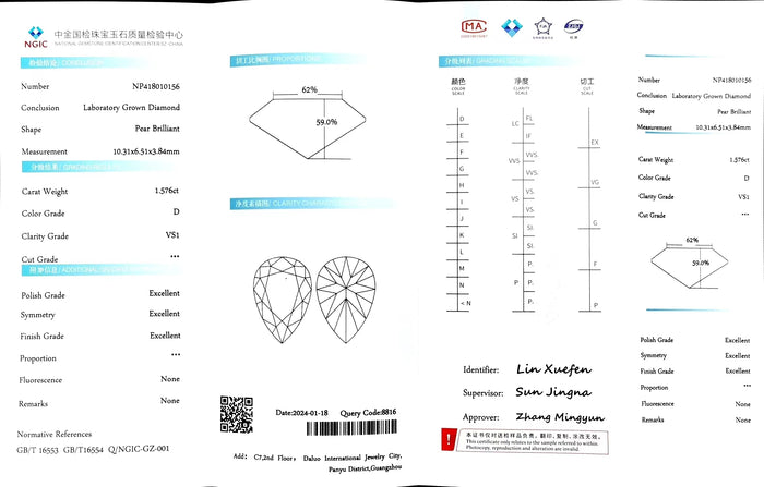 NGIC Certificate #: NP418010156(We will ship the lab-grown diamond to you along with the NGIC certificate. You can scan the barcode on the report to access the third party certificate.)