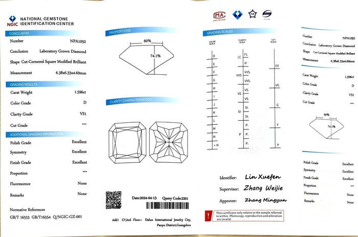NGIC Certificate #: NPA1052(We will ship the lab-grown diamond to you along with the NGIC certificate. You can scan the barcode on the report to access the third party certificate.)