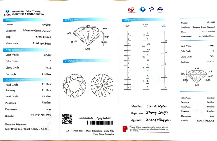 NGIC Certificate #: NPA2096(We will ship the lab-grown diamond to you along with the NGIC certificate. You can scan the barcode on the report to access the third party certificate.)