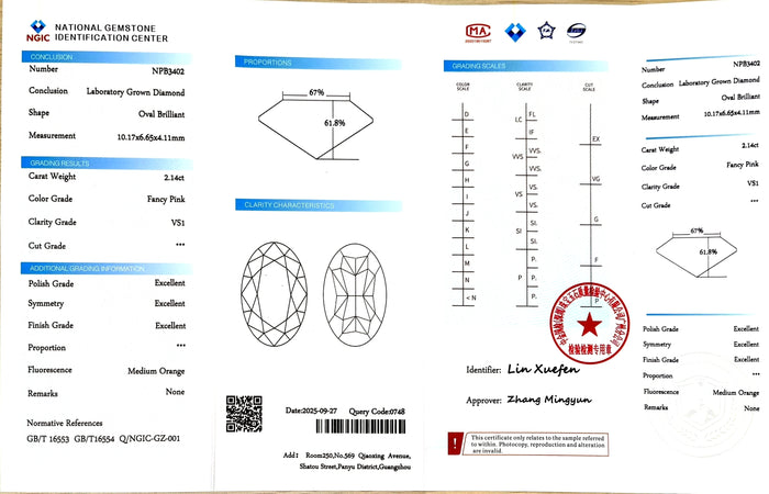 NGIC Certificate #: NPB3402(We will ship the lab-grown diamond to you along with the NGIC certificate. You can scan the barcode on the report to access the third party certificate.)