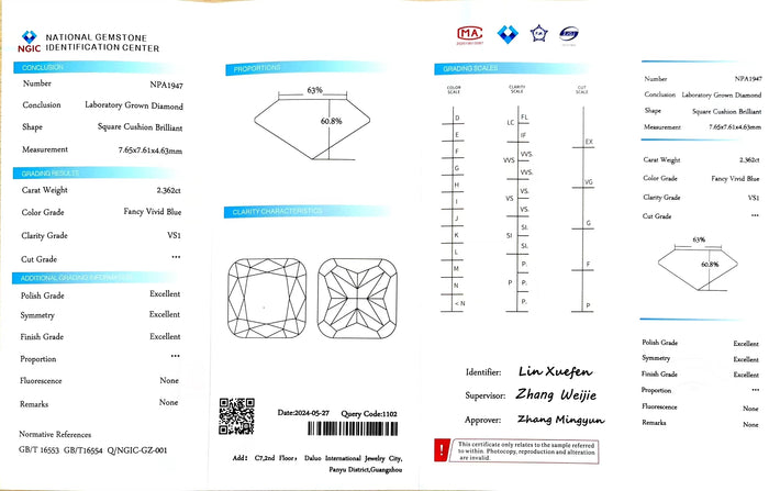 NGIC Certificate #: NPA1947(We will ship the lab-grown diamond to you along with the NGIC certificate. You can scan the barcode on the report to access the third party certificate.)