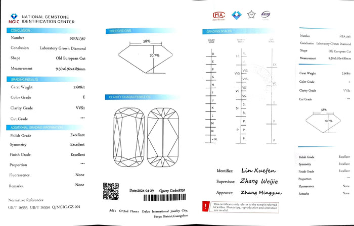 NGIC Certificate #: NPA1367(We will ship the lab-grown diamond to you along with the NGIC certificate. You can scan the barcode on the report to access the third party certificate.)
