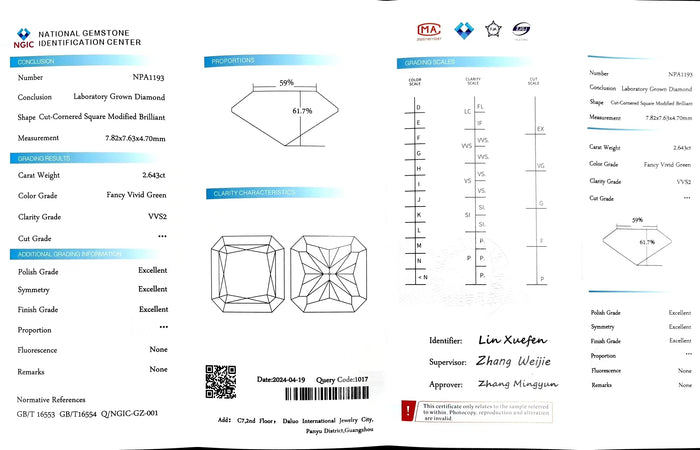 NGIC Certificate #: NPA1193(We will ship the lab-grown diamond to you along with the NGIC certificate. You can scan the barcode on the report to access the third party certificate.)