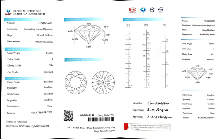 NGIC Certificate #: NP422010182(We will ship the lab-grown diamond to you along with the NGIC certificate. You can scan the barcode on the report to access the third party certificate.)