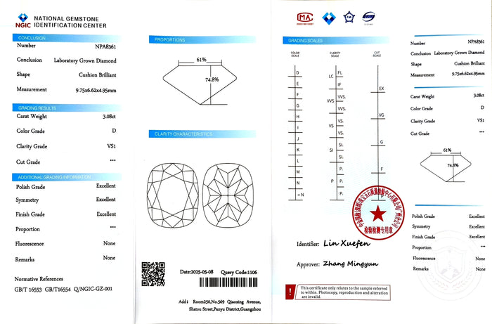 NGIC Certificate #: NPA8361(We will ship the lab-grown diamond to you along with the NGIC Certificate. You can scan the barcode on the report to access the third party certificate.)