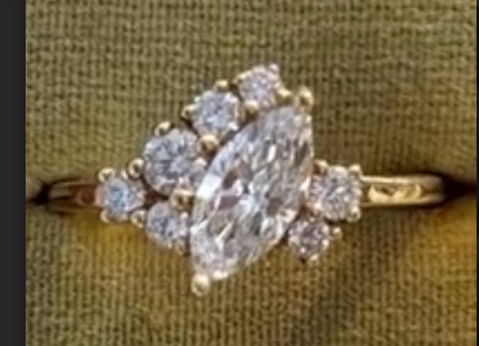 $414 for this ring with 1ct GHI color marquise moissanite center, no bigger than 2.8mm round moissanite, pink yellow sapphire accents in 10K rose gold , size 4.75