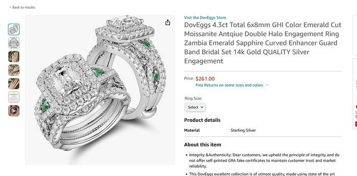 $294 for this ring set with 2ct(6*8mm) GHI color Astro radiant moissanite center, moissanite and emerald accents in SS ( 1 engagement ring and 1 enhancer.) Size 5.75