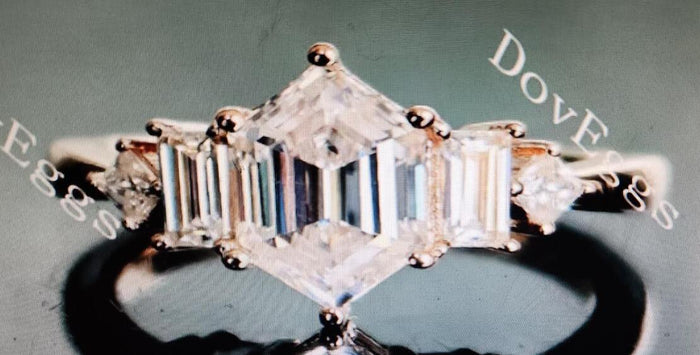 $523 for this ring with a 3ct GHI color hexagon moissanite center, 2 pieces 1ct (5*7mm) Stardust Grey emerald moissanite and ruby princess accents in SS.