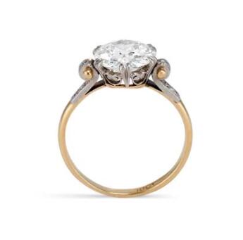 Engagement ring:$911 for this ring with a 3ct(9mm) OEC GHI color round moissanite center, moissanite accents in 18K yellow gold band and 18K white gold scroll.