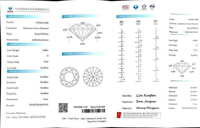 NGIC Certificate #: NP330110008(We will ship the lab-grown diamond to you along with the NGIC certificate. You can scan the barcode on the report to access the third party certificate.)