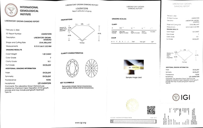 IGI Certificate #: LG620472298(We will ship the lab-grown diamond to you along with the IGI certificate. You can scan the barcode on the report to access the third party certificate.)
