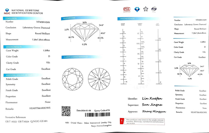 NGIC Certificate #: NP409010509(We will ship the lab-grown diamond to you along with the NGIC certificate. You can scan the barcode on the report to access the third party certificate.)