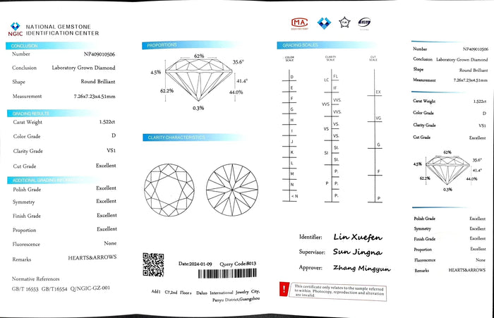 NGIC Certificate #: NP409010506(We will ship the lab-grown diamond to you along with the NGIC certificate. You can scan the barcode on the report to access the third party certificate.)