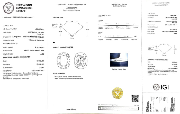 Center stone: 2.10ct(6.83*7.95*4.52mm), cushion, Fancy Vivid Orangey Pink. VVS2 Clarity, Excellent cut