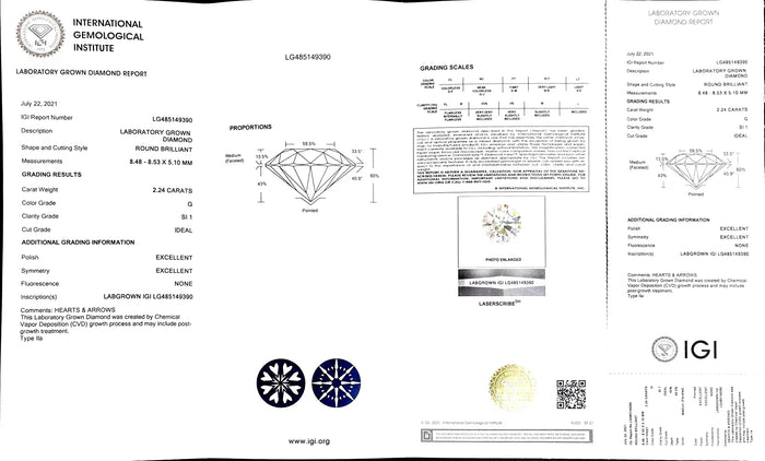 IGI Certificate #: LG485149390(We will ship the lab-grown diamond to you along with the IGI certificate. You can scan the barcode on the report to access the third party certificate.)