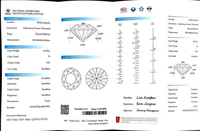 NGIC Certificate #: NP321100101(We will ship the lab-grown diamond to you along with the NGIC certificate. You can scan the barcode on the report to access the third party certificate.)