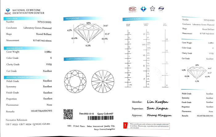 NGIC Certificate #: NP315120203(We will ship the lab-grown diamond to you along with the NGIC certificate. You can scan the barcode on the report to access the third party certificate.)