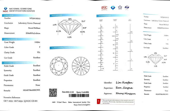 NGIC Certificate #: NP330120315(We will ship the lab-grown diamond to you along with the NGIC certificate. You can scan the barcode on the report to access the third party certificate.)