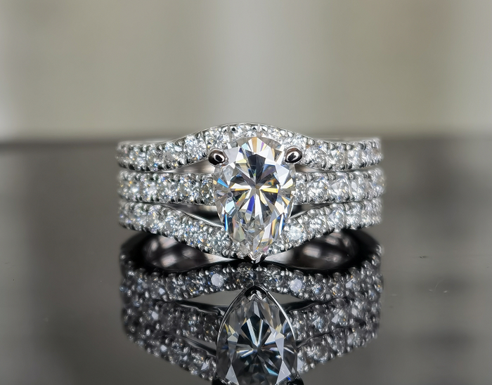 Center stone of picture is 2ct(6*9mm) G-H color pear cut moissanite. Ring setting is sterling silver.