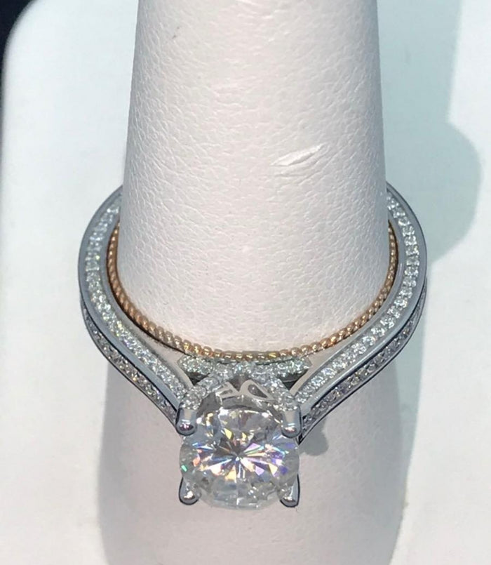 Center stone of picture is 2ct(7*9mm) FG color oval H&A Cut DovEggs moissanite. Ring setting is 14k white gold and rose gold.