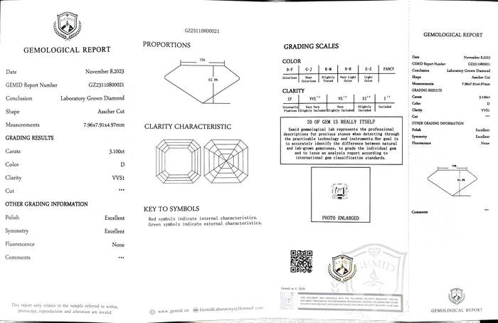 GEMID Certificate #: GZ23110800021(We will ship the lab-grown diamond to you along with the GEMID certificate. You can scan the barcode on the report to access the third party certificate.)