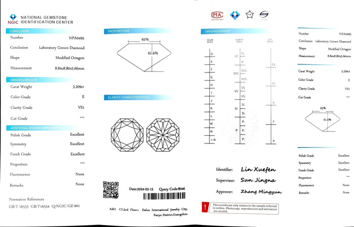 NGIC Certificate #: NPA0495(We will ship the lab-grown diamond to you along with the NGIC certificate. You can scan the barcode on the report to access the third party certificate.)