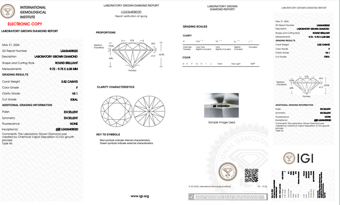 IGI Certificate #: LG636408020(We will ship the lab-grown diamond to you along with the IGI ertificate. You can scan the barcode on the report to access the third party certificate.)