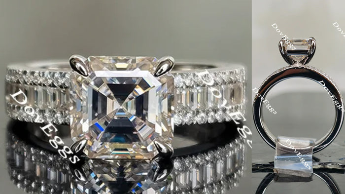 Doveggs asscher half eternity channel set and pave moissanite engagement ring