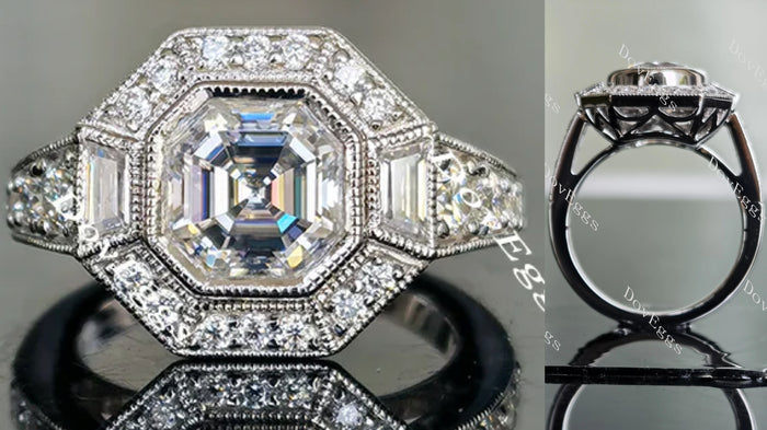 The center stone of picture is around 2ct(7mm) DEF color asscher moissanite. Ring setting is 10k white gold.