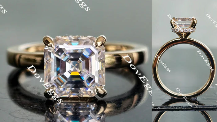 The center stone of picture is 3ct(8mm) DEF color asscher DovEggs moissanite,accents: round moissanites. Ring setting is 14k yellow gold.