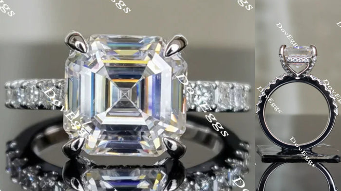 The center stone of picture is 5ct(10mm*10mm) DEF color asscher DovEggs moissanite,accents on the band is princess cut moissanite. Ring setting is 14k white gold.