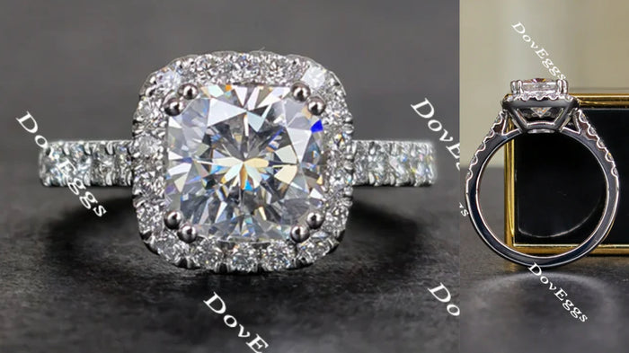 The center stone of picture is 3ct(8.5mm) cushion H&A DovEggs moissanite. Ring setting is 10k white gold.