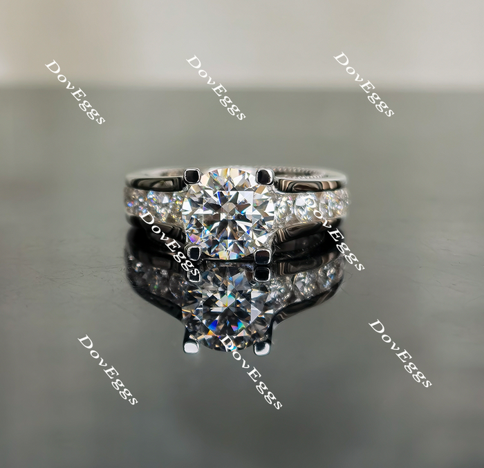 The center stone of picture is 2ct(8mm*8mm) DEF color round H&A cut DovEggs moissanite. Accents: round DEF color moissanite and topaz birthstone. Ring setting is 14k white gold.