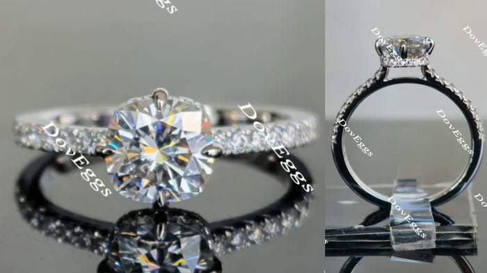 The center stone of picture is 1.5ct(7mm) GHI color cushion H&A cut moissanite. Ring setting is 10k white gold.