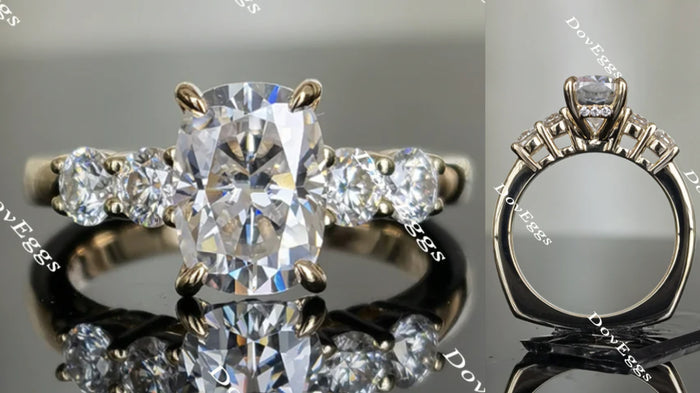 The center stone of picture is 2ct(6*8mm) G-H color cushion astro cut moissanite. Ring setting is 10K yellow gold.