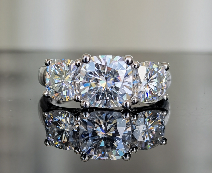 Center stone of picture is 1.1ct-2ct-1.1ct (6mm-7.5mm-6mm) GHIcolor cushion DovEggs moissanite. total 4.2ct. Ring setting is sterling silver.
