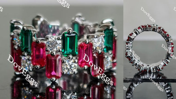 The center stone of picture is 0.5ct(3*5mm) emerald shape zambia emerald & ruby combo colored gem. Accents: around 3mm GHI color round moissanite. Band setting is sterling silver.