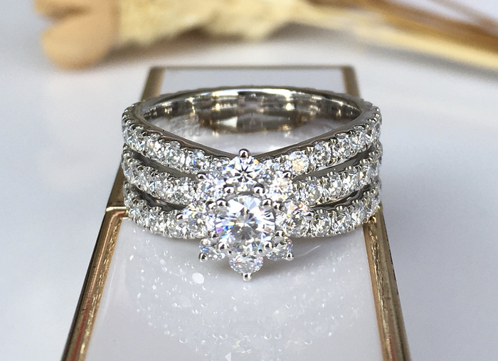The center stone of picture is 0.3ct(4mm) GHI color round H&A DovEggs moissanite. moissanite accents. Ring setting is 14k white gold.