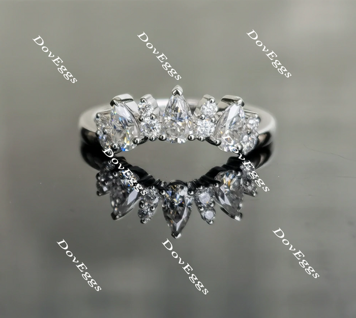 The stone of picture is 3 pieces of pear H&A moissanites and 4 pieces of round H&A moissanites. Ring setting is 10k white gold.