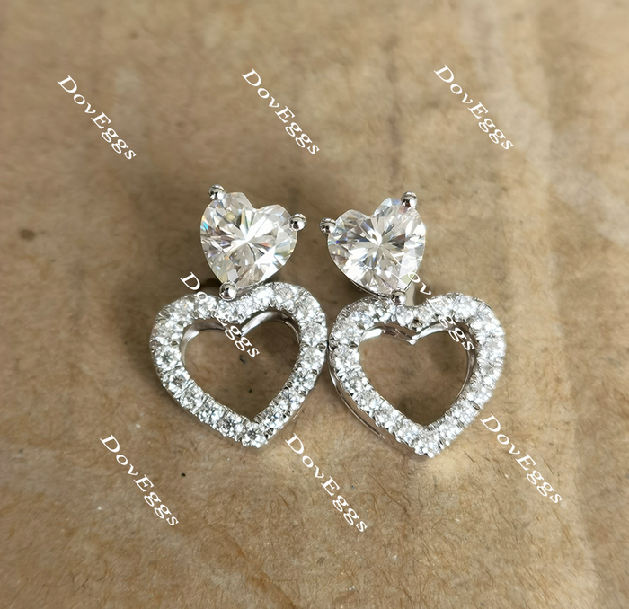 The center stone of picture is 1ct(6.5mm)/per GHI color heart H&A and heart astro cut moissanite. Earring setting is sterling silver. For the sterling silver setting, post will be in 10k white gold.