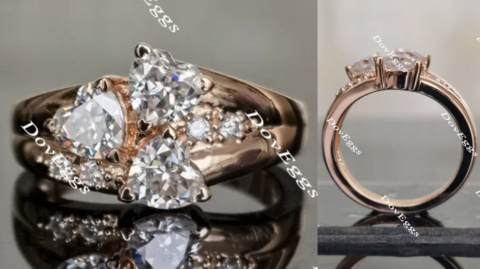 The center stone of picture is 0.5ct(5mm) GHI color heart Astro cut moissanite. Ring setting is 10k rose gold.