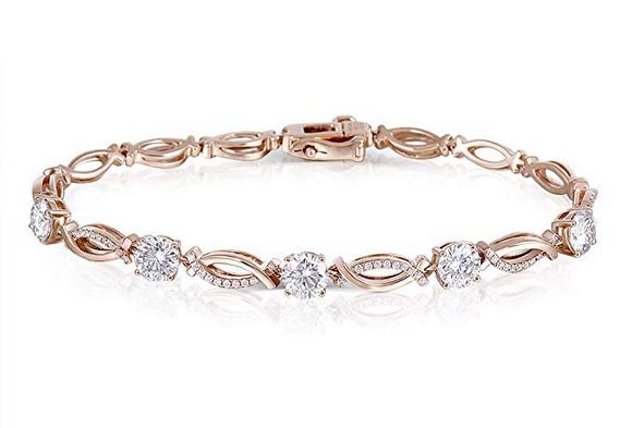 The center stone of picture is 5 pieces 0.5ct(5mm)def color moissanite,moissanite accents . Bracelet setting is 14k rose gold.