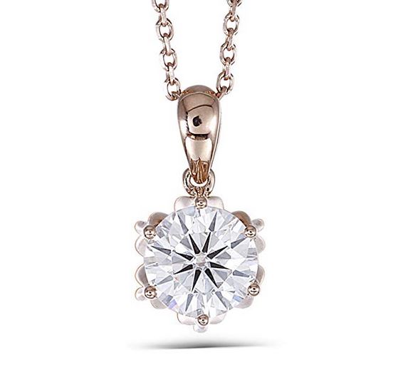 The center stone of picture is 1ct(6.5mm) round moissanite. Necklace setting is 14k rose gold. If you need a chain, the color of 14k and 18k chain will be the same as the pendant. We will ship a sterling silver chain to you if you order the 10K pendent only.