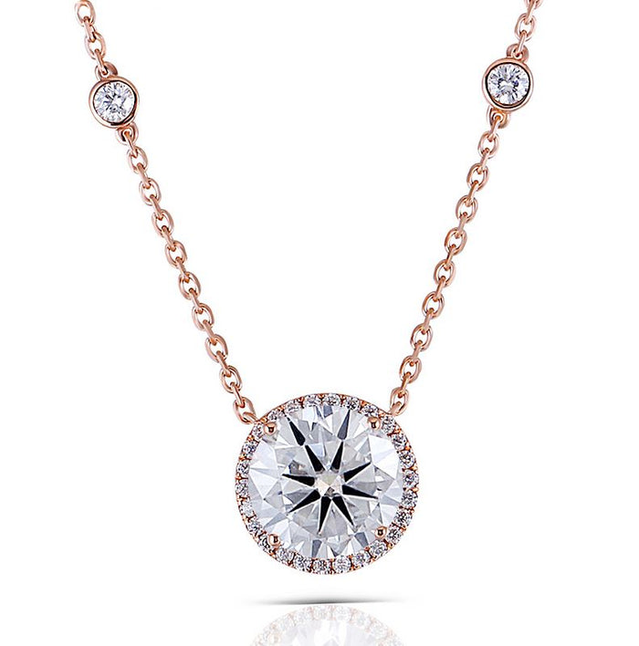 Center stone: 5ct(11mm) Round H&A cut, GHI (near colorless) moissanite, VS1-VVS1 clarity