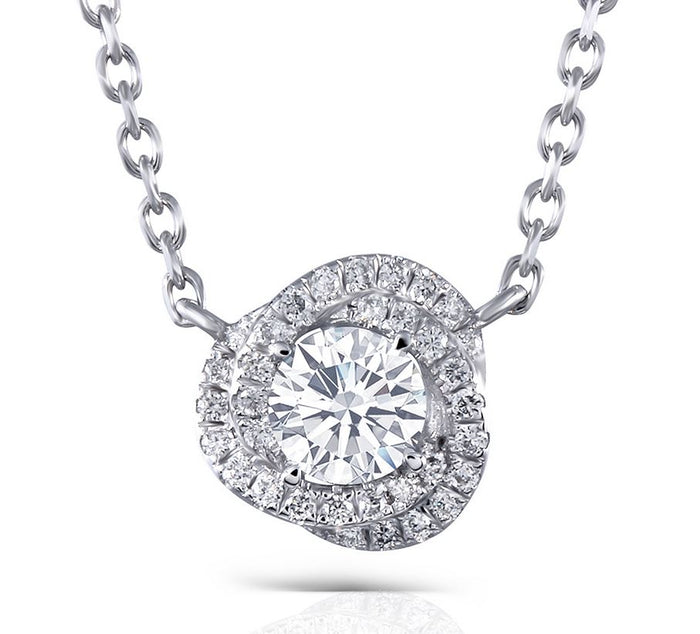 The center stone of picture is 0.5ct(5mm) round moissanite,moissanite accents. Pendant setting is 14k white gold.