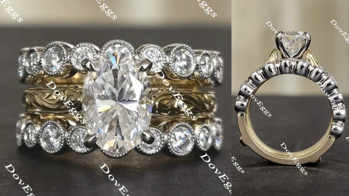 The center stone of picture is 2.5ct(7.5*9.5mm) GHI color astro cut oval DovEggs moissanite. Ring setting is 10k yellow/white gold.