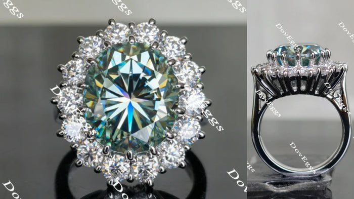 The center stone of picture is 10ct(12*14mm) oval H&A cut Peacock blue DovEggs moissanite. Ring setting is 14k white gold.